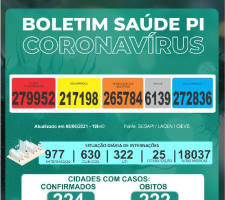 Os casos confirmados no estado somam 279.952 distribuídos em todos os municípios piauienses. Já os óbitos pelo novo coronavírus chegam a 6.139 e foram registrados em 222 municípios.