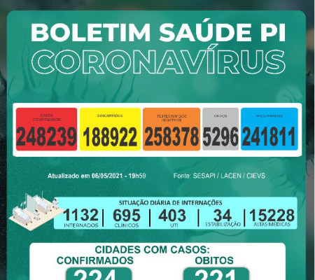 Dos leitos existentes na rede de saúde do Piauí para atendimento à Covid-19, há 1.132 ocupados, sendo 695 leitos clínicos, 403 UTIs e 34 em leitos de estabilização. As altas acumuladas somam 15.228 até o dia seis de maio de 2021.