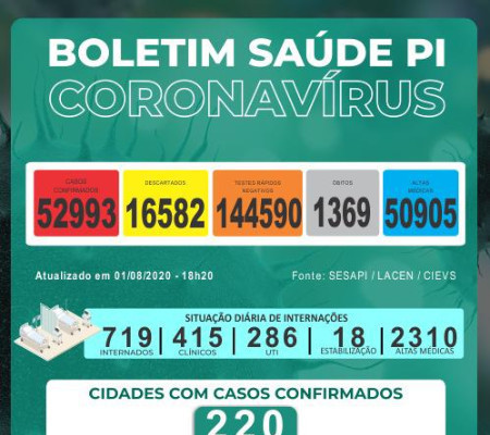 Nenhum município novo entrou na lista daqueles com casos confirmados, permanecendo em 220 o número de cidades atingidas pela pandemia, o que representa 98,02% do território piauiense. Apenas quatro municípios não tiveram casos registrados de Covid-19 até agora: Arraial, Canavieira, Jardim do Mulato e João Costa. Dos leitos existentes na rede de saúde do Piauí para atendimeto à Covid-19, há 719 ocupados, sendo 415 leitos clínicos, 286 UTIs e 18 leitos de estabilização. As altas acumuladas somam 2.310 e as altas do dia, 65.