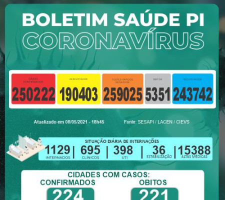 Os casos confirmados no estado somam 250.222 distribuídos em todos os municípios piauienses. Já os óbitos pelo novo coronavírus chegam a 5.351 e foram registrados em 221 municípios.