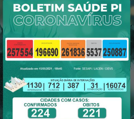 Dos leitos existentes na rede de saúde do Piauí para atendimento à Covid-19, há 1.130 ocupados, sendo 712 leitos clínicos, 387 UTIs e 31 em leitos de estabilização. As altas acumuladas somam 16.074 até o dia 16 de maio de 2021.