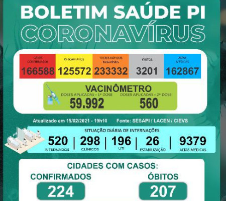 Dos leitos existentes na rede de saúde do Piauí para atendimento à Covid-19, há 520 ocupados, sendo 298 leitos clínicos, 196 UTIs e 26 em leitos de estabilização. As altas acumuladas somam 9.379 até o dia 15 de fevereiro de 2021.