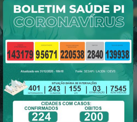 Dos leitos existentes na rede de saúde do Piauí para atendimento à Covid-19, há 401 ocupados, sendo 243 leitos clínicos, 155 UTIs e três em leitos de estabilização. As altas acumuladas somam 7.545 até o dia 31 de dezembro.