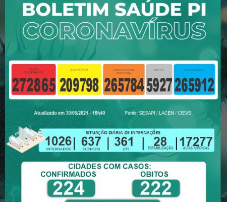 Os casos confirmados no estado somam 272.865 distribuídos em todos os municípios piauienses. Já os óbitos pelo novo coronavírus chegam a 5.927 e foram registrados em 222 municípios.