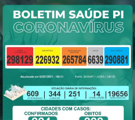 Os casos confirmados no estado somam 298.129 distribuídos em todos os municípios piauienses. Já os óbitos pelo novo coronavírus chegam a 6.639 e foram registrados em 222 municípios.