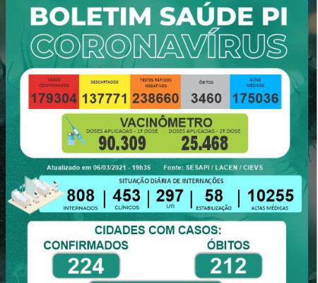 Os casos confirmados no estado somam 179.304 distribuídos em todos os municípios piauienses. Já os óbitos pelo novo coronavírus chegam a 3.460 e foram registrados em 212 municípios. Até agora, morreram 2.026 homens e 1.434 mulheres.
