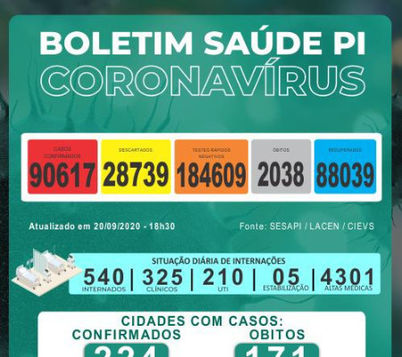 Neste dia 20 de setembro foi confirmado apenas o óbito de um homem de 76 anos, natural de Amarante. Com isso, as mortes pelo novo coronavírus chegam a 2038, registradas em 171 municípios. Até agora, morreram 1.173 homens e 865 mulheres.