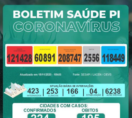Os casos confirmados no estado somam 121.428 distribuídos em todos os municípios piauienses. Já os óbitos pelo novo coronavírus chegam a 2.556 e foram registrados em 195 municípios. Até agora, morreram 1.478 homens e 1.078 mulheres.