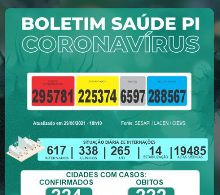 Os casos confirmados no estado somam 295.781 distribuídos em todos os municípios piauienses. Já os óbitos pelo novo coronavírus chegam a 6.597 e foram registrados em 222 municípios.