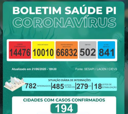 No total, o Piauí tem 14 476 casos confirmados e 502 mortes em decorrência do novo coronavirus.