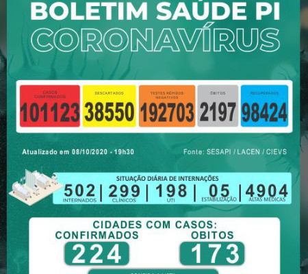 As 224 cidades piauienses foram atingidas pela pandemia. Os casos confirmados no estado somam 101.123. Já os óbitos pelo novo coronavírus chegam a 2.197 e foram registrados em 173 municípios. Até agora, morreram 1.266 homens e 931 mulheres.