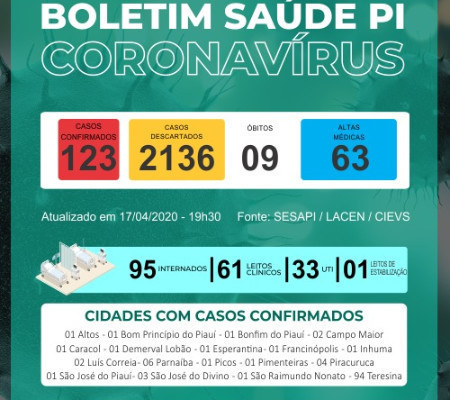 A Secretaria Estadual da Saúde (SESAPI) confirmou na noite desta sexta-feira (17/04), a nona morte por coronavírus no Piauí. Um homem, de 72 anos, natural de Bom Princípio, veio a óbito no Hospital Dirceu Arcoverde, em Parnaíba. Ele tinha histórico de hipertensão.