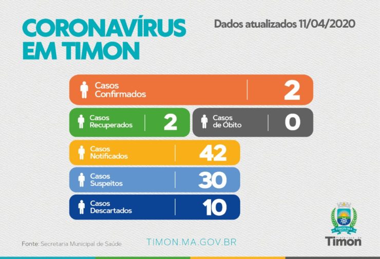 Dados do último boletim emitido pela Secretaria Municipal de Saúde de Timon confirmaram mais 4 casos suspeitos de coronavírus no município. Até a manhã deste sábado, 11 de abril, a cidade soma 2 casos confirmados – estes já recuperados –, 42 notificados, 30 suspeitos e 10 descartados.
