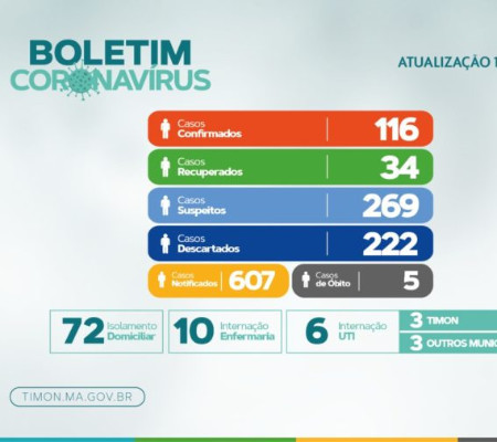 Em mais uma atualização do boletim epidemiológico divulgado pela Secretaria de Saúde de Timon, o aumento no número de casos da COVID- 19 foi registrado no município. Os dados apontaram na noite de segunda-feira (18): 607 casos notificados, 269 casos suspeitos, 222 casos descartados, 116 casos confirmados, 34 casos recuperados e 05 óbitos. Sobre os registros de óbito mais recentes: