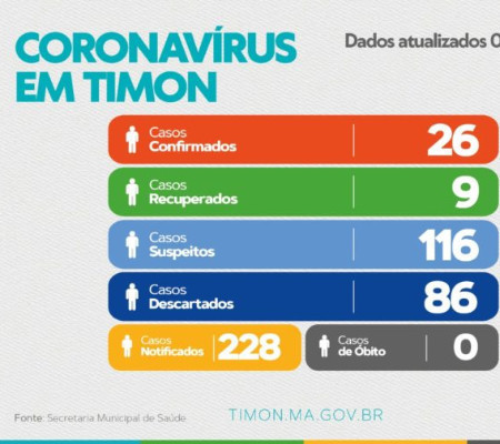 A Secretaria Municipal de Saúde divulgou na manhã desta segunda-feira (26), o boletim epidemiológico informando que o município de Timon, no Maranhão, já tem 26 casos confirmados do novo coronavírus. O número passou de 22 para 26 nas últimas 24 horas e nenhum óbito foi registrado na cidade. Os dados apontam que das 26 pessoas infectadas, nove já se recuperaram da doença. O boletim também mostra que 86 casos foram descartados e 116 ainda estão sendo acompanhados e tratados como casos suspeitos de covid-19.