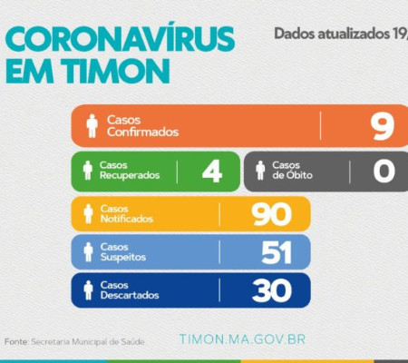 A Secretaria de Saúde de Timon divulgou o boletim epidemiológico de domingo (19/04). Os dados mostram atualização sobre casos de Covid-19 no município.  Até o início da noite, foram registrados os seguintes números: 9 casos confirmados, 0 óbitos, 4 recuperados, 90 notificados, 51 suspeitos e 30 descartados.