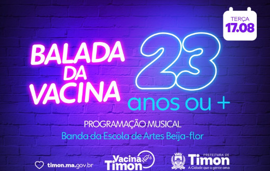 A ação será ao som da banda da Escola de Artes Beija-Flor que comanda a balada. Para se vacinar basta apresentar os seguintes documentos: RG, CPF ou Cartão do SUS e comprovante de residência de Timon em seu nome. As pessoas que ainda não receberam a 1ª dose e estão também acima dessa faixa etária devem procurar o ponto de vacinação.