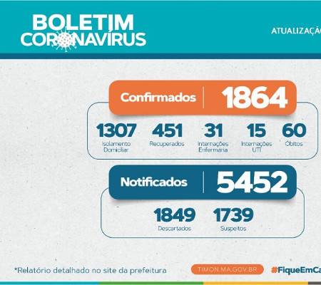 Um novo levantamento feito pela Secretaria Municipal de Saúde, em Timon, divulgado nesta sexta (26/06) mostra que a cidade têm 5452 casos notificados de Covid-19, 1739 suspeitos, 1849 descartados, 1864 confirmados, 451 recuperados e 60 óbitos.