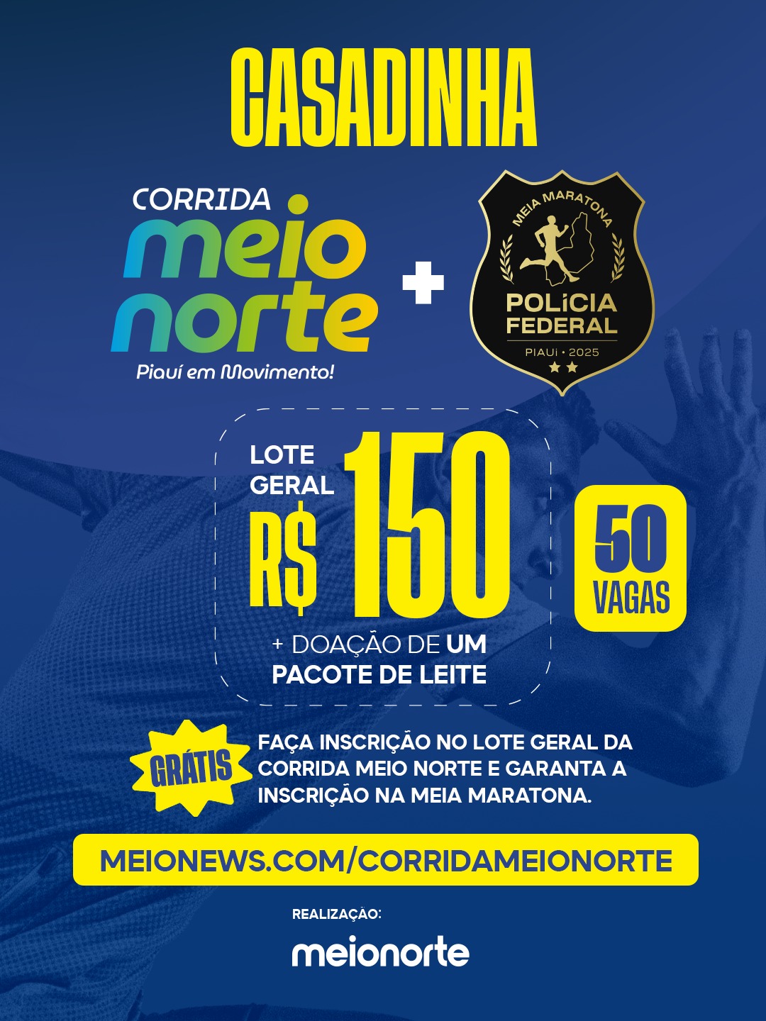 Mais uma novidade promete agitar os corredores de rua em Teresina: a “casadinha” entre a Corrida Meio Norte – Piauí em Movimento e a Meia Maratona da Polícia Federal do Piauí. A promoção garante ao atleta duas participações em grandes provas pagando apenas uma inscrição. Ao se inscrever no lote geral da Corrida Meio Norte, que será realizada no dia 19 de outubro, às 6h, com largada no Shopping Rio Poty, o participante recebe automaticamente um código exclusivo que dá direito à inscrição gratuita na Meia Maratona da Polícia Federal.