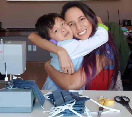 Elisa Lisot, influenciadora costurando máscaras com seu filho |