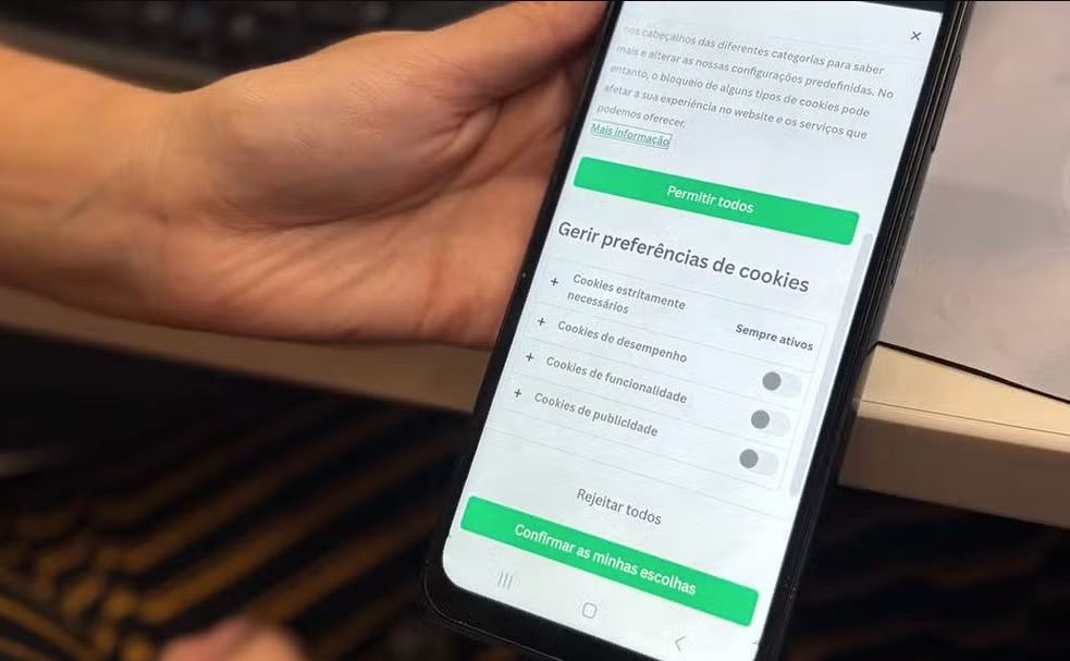 Depois de escolher suas preferências, basta clicar em “confirmar minhas escolhas”. Em muitos sites, há ainda a opção “rejeitar todos”, exceto os essenciais.