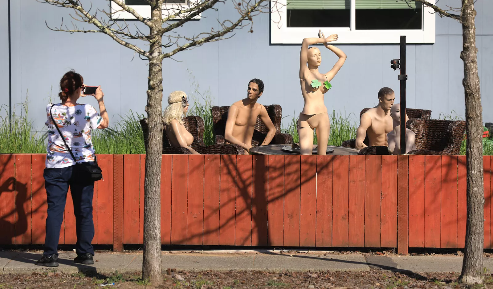Os manequins nus estão em torno de um barril com a inscrição: "reservado para o vizinho intrometido que reclamou da minha cerca para a prefeitura".