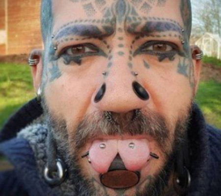 Paul começou pelas tatuagens. Cobriu várias partes do corpo, incluindo o rosto. Não demorou para dar passos mais largos. O britânico teve a língua bifurcada, implantou um plug de 3,8 centímetros de diâmetro no lábio inferior e ganhou um buraco em cada narina. Para completar, ele alargou ao extremo os lobos das orelhas, implantou caveiras de silicone em uma das mãos e fez um desenho artístico no pescoço usando prego e maçarico. Ele calcula que já gastou cerca de R$ 70 mil nos procedimentos estéticos.