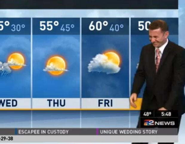 O apresentador americano Andy Parker, da emissora de TV WGRZ, teve um ataque de risos enquanto apresentava a previsão do tempo.