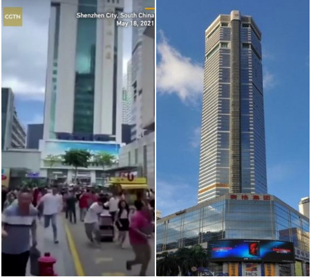 Centenas de pessoas foram vistas fugindo da base de um arranha-céu de 300 metros no sul da China nesta terça-feira (18), depois que o prédio de 72 andares começou a tremer e balançar.