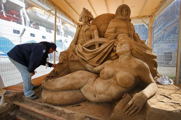 O artista polonês Wiaczeslav Borecki foi fotografado enquanto trabalhava em sua escultura de areia em Rostock, na Alemanha, que tinha como tema o ?Descobrimento do Mundo?.