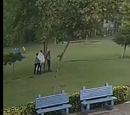 Câmeras de segurança flagraram o momento assustador. Nas imagens, quatro trabalhadores de horticultura local estavam parados ao lado de uma árvore para se proteger da chuva. Após a descarga elétrica, as pessoas caem no chão imediatamente.
