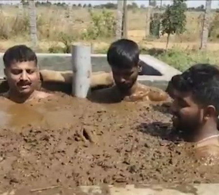 Nas imagens é possível ver um pequeno tanque repleto do esterco de vaca, onde eles mergulham literalmente no material fecal, com sendo uma prática normal, sem temer, inclusive, infecções.