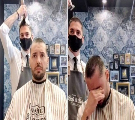 Momento em que Neftali chora de emoção ao ver o amigo barbeiro raspar o próprio cabelo. (Foto: Reprodução/TikTok )
