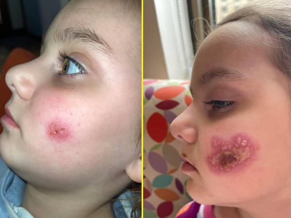Segundo a responsável pelo blog The Crone’s Cottage, a filha ficou quatro dias na unidade pediátrica. Após análise da ferida, os médicos revelaram que a criança tinha adquirido o vírus herpes simples (também conhecido como herpes labial). “Como eu tinha uma afta que não estava totalmente curada e estava brincando de beijar minha filha, passei o vírus para ela através de uma pequena espinha no rosto dela. Isso é algo que você ouve falar, mas nunca pensa que realmente aconteceria com você”, afirma a americana.