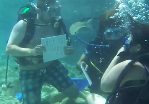 Anthony Taylor, de 27 anos, estava mergulhando com Stephanie Walker, de 26 anos, quando pegou uma placa com os dizeres ?quer se casar comigo??, e mostrou para a namorada.