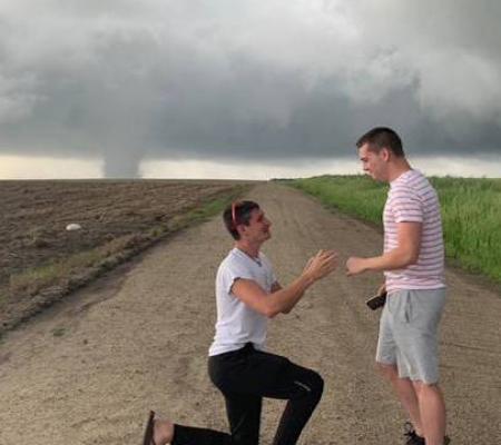 Uma foto registrando Joey Krastel, de 27 anos, ajoelhado diante de Chris Scott, de 23, mostrou ao fundo um tornado que vinha na direção deles, no Kansas (EUA). "Os dois amores da minha vida", escreveu Joey no Twitter.