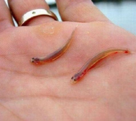 Esse peixinho, nativo da Amazônia, na verdade é um parasita maldito! Ele apresenta um formato alongado semelhante ao das enguias, e normalmente conta com 7 ou 8 centímetros de comprimento, embora alguns exemplares cheguem a medir 40 centímetros. O candiru ganhou notoriedade por ter o inconveniente hábito de penetrar pela uretra ou ânus de banhistas desavisados e por se instalar no interior dos genitais.