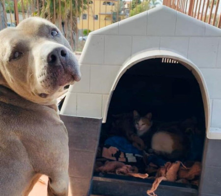 Com a vigia do Pit Bull, a felina tornou-se mamãe de dois belos gatinhos, que logo foram levados para dentro de casa para maiores cuidados e proteção. Desde então, Hades e a gata Nicol tornaram-se grandes amigos e começaram a passar boa parte do tempo juntos.