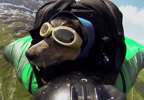 Usando um traje conhecido como "wingsuit", que faz com que o utilizador crie ?asas? aos abrir os braços e as pernas, Potter fez um salto de base jump com o cão preso a uma mala, com direito a óculos protetores para o animal.