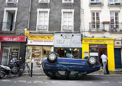Em uma rua de Nantes, na França, um carro estacionado de ponta cabeça chamou a atenção de pessoas que passavam pelo local, próximo a um centro comercial da cidade.