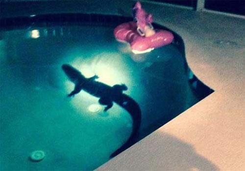 Um casal de Bradenton, no estado da Flórida (EUA), teve um enorme susto ao encontrar um jacaré dentro de sua piscina durante a madrugada. O aligátor de 2,4 metros de comprimento invadiu a residência para dar um mergulho na piscina.