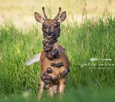 A fotógrafa Julie Carrow flagrou uma cena chocante em Pipestone (Minnesota, EUA): um cervo com o corpo coberto por tumores. Julie postou fotos no Facebook, dizendo: "Partiu o meu coração. Espero que esta postagem ajude esse rapazinho". As informações são do Jornal Extra.
