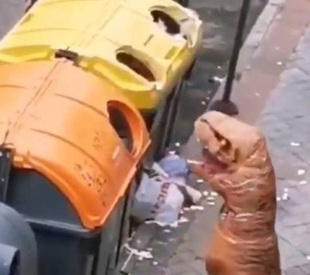 "Na Espanha foi decretado estado de emergência e pessoas flagradas na rua sem um motivo plausível são multadas. Mas há um cidadão espanhol circulando com fantasia de tiranossauro rex. Nesse vídeo o tiranossauro rex é flagrado levando o lixo para fora e voltando correndo pra casa", escreveu a internauta que compartilhou o flagra no tuíte.