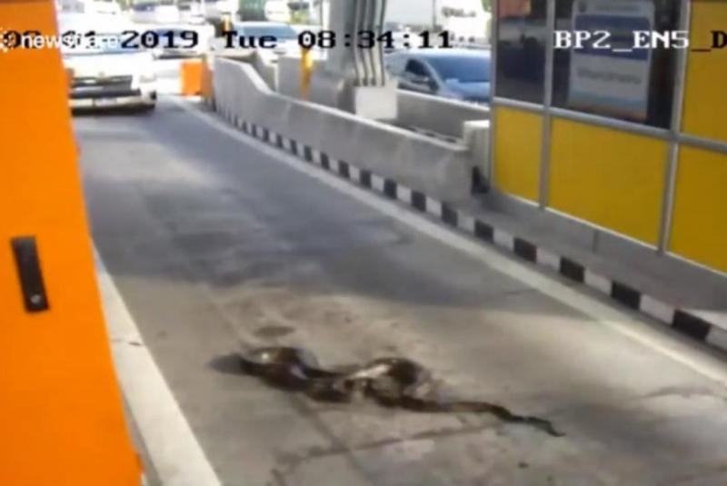 A câmera do circuito fechado do posto de pedágio da rodovia tailandesa registrou a cena bizarra. Como a cobra chegou até o pedágio é a questão. A resposta mais razoável é que a píton pegou carona no carro e, quando o motorista parou para pagar o pedágio, ela voltou a deslizar pelo chão. Por alguma razão, o réptil saiu ileso da situação.