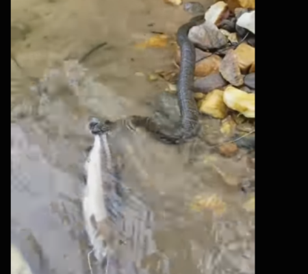 Cobra “bandida” tenta furtar peixe fisgado em beira de lago; vídeo