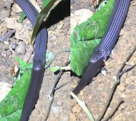 Ao ouvir um ruído estranho, ele descobriu que esse ruído foi produzido por uma cobra negra muito comprida, que tentava engolir um lagarto, que por sinal, também não era pequeno.