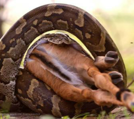 “Ver uma píton africana engolir um jovem impala (espécie de antílope) é uma visão única na vida. A cobra calmamente engoliu sua refeição sem nos dar qualquer atenção e, então, pude me aproximar para fotografar”, contou Winckelmann ao Daily Mail. “Quando cheguei ao local, ela já começava a deslocar seu maxilar para engoli-lo”.