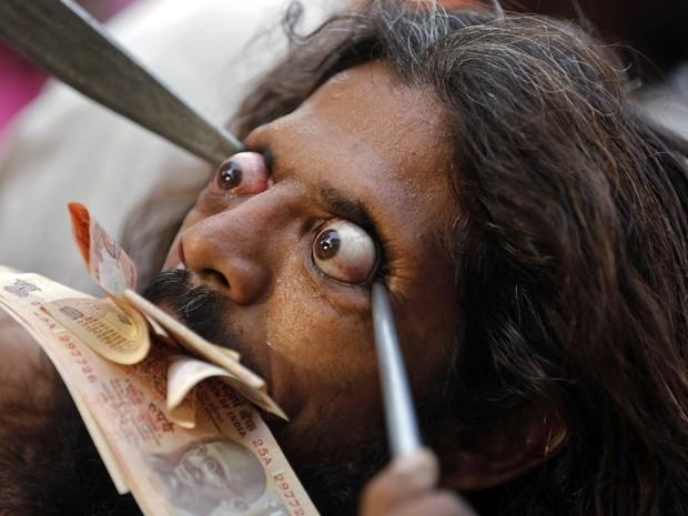 Um peregrino muçulmano foi fotografado ?espetando? seus olhos com uma espada e um objeto pontiagudo dentro do santuário da entidade muçulmana Shah-e-Alam em Ahmedabad, na Índia.