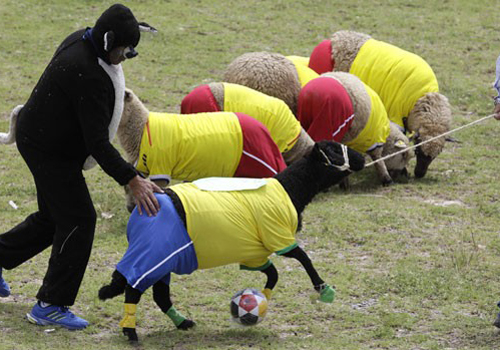 A cidade colombiana de Nobsa promoveu no domingo (1) um jogo de futebol entre ovelhas. Os animais usaram os uniformes do Brasil e da Colômbia, em partida que fez parte do Dia Internacional do Poncho, comemorado anualmente nesta região colombiana, onde artesãos locais fazem ponchos de lã de ovelha, utilizando técnicas ancestrais.