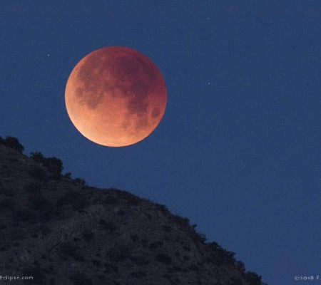 Lua avermelhada de eclipse sobre as Montanhas Chiricahua, no Arizona. Créditos: Fred Espenak/MrEclipse.com